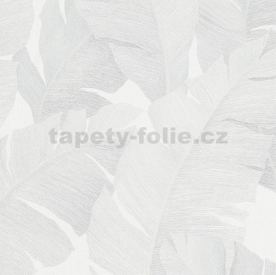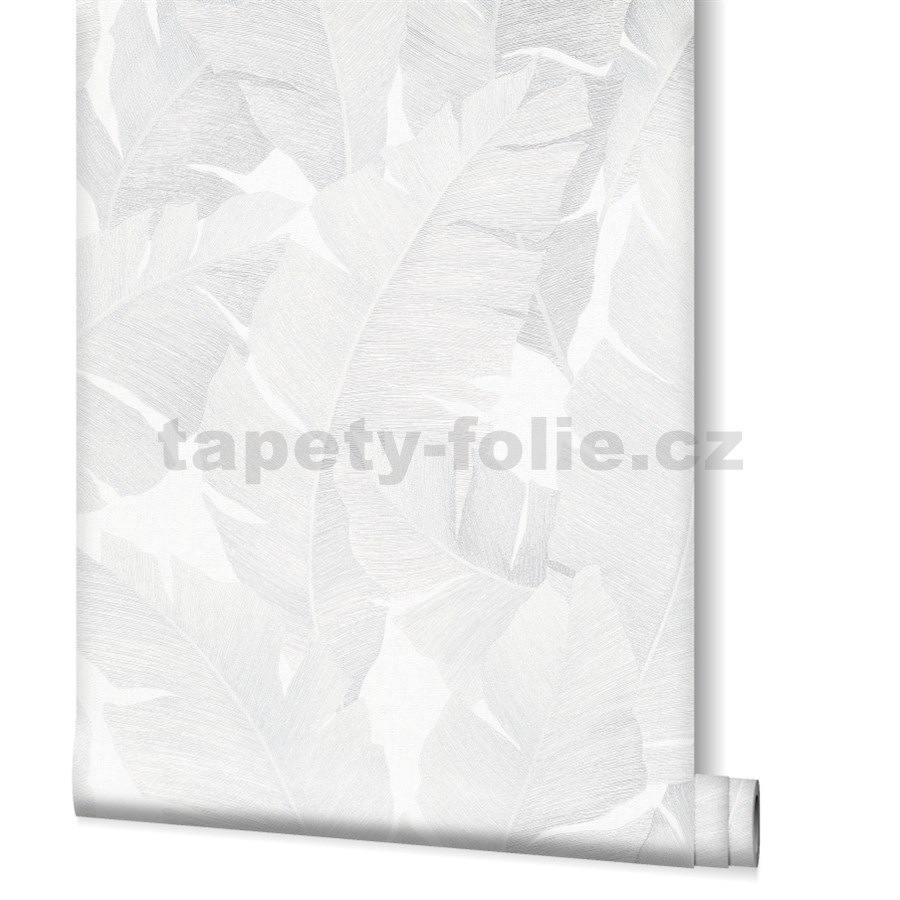 Luxusní vliesové tapety na zeď Avalon velké listy světle šedé na bílém podkladu