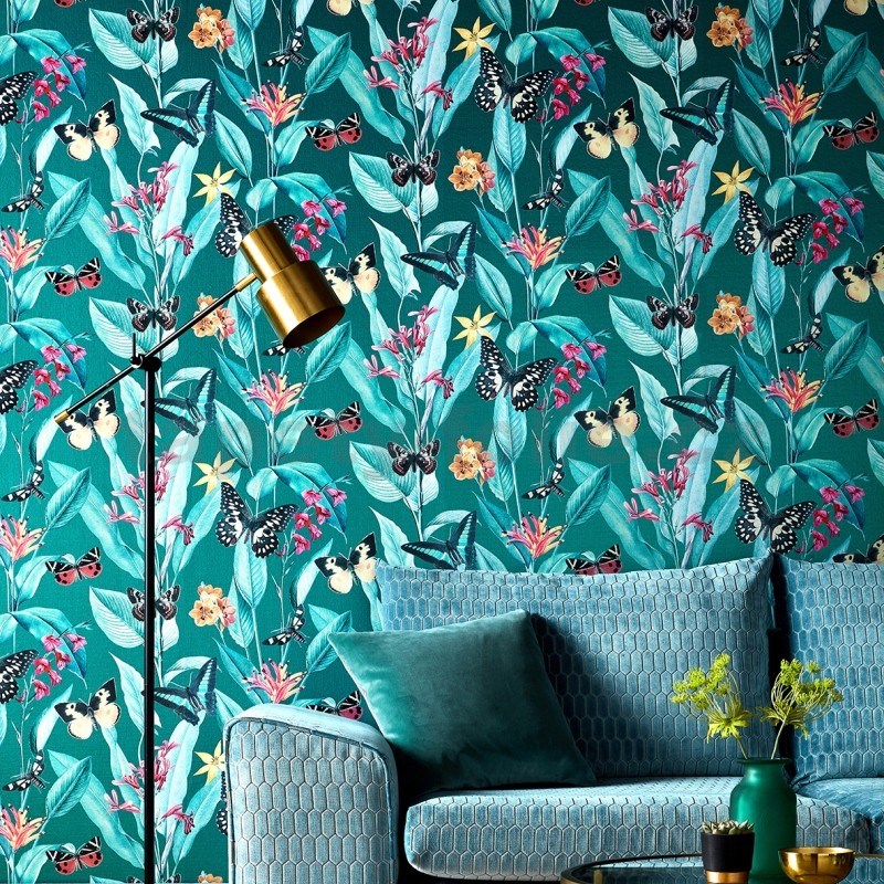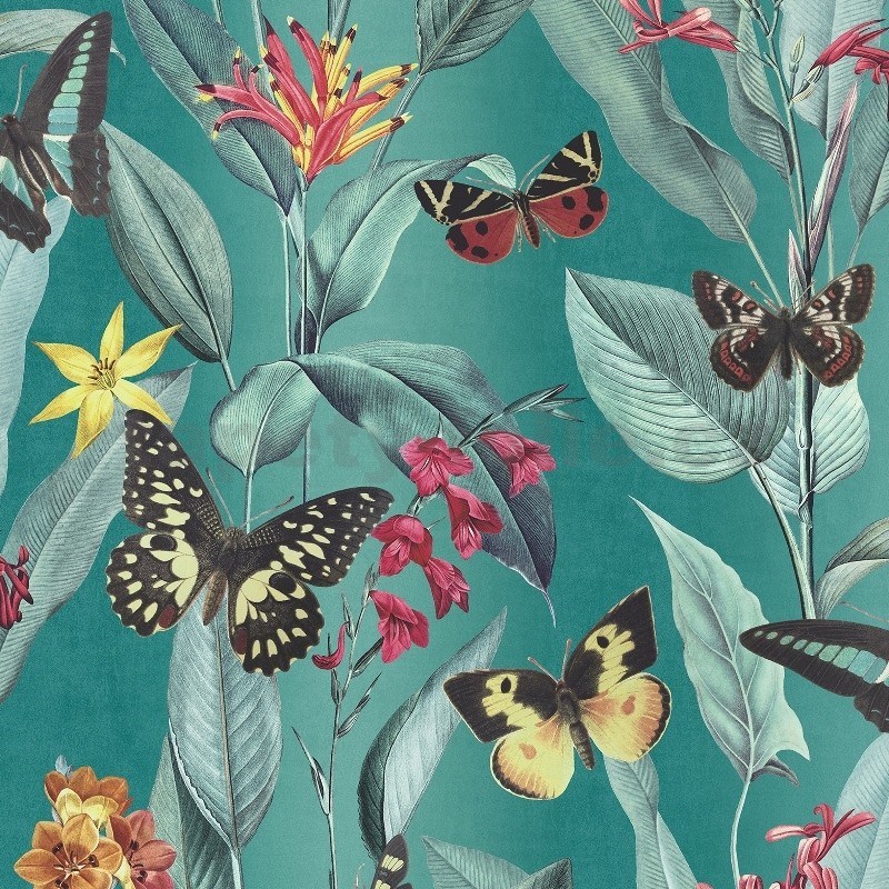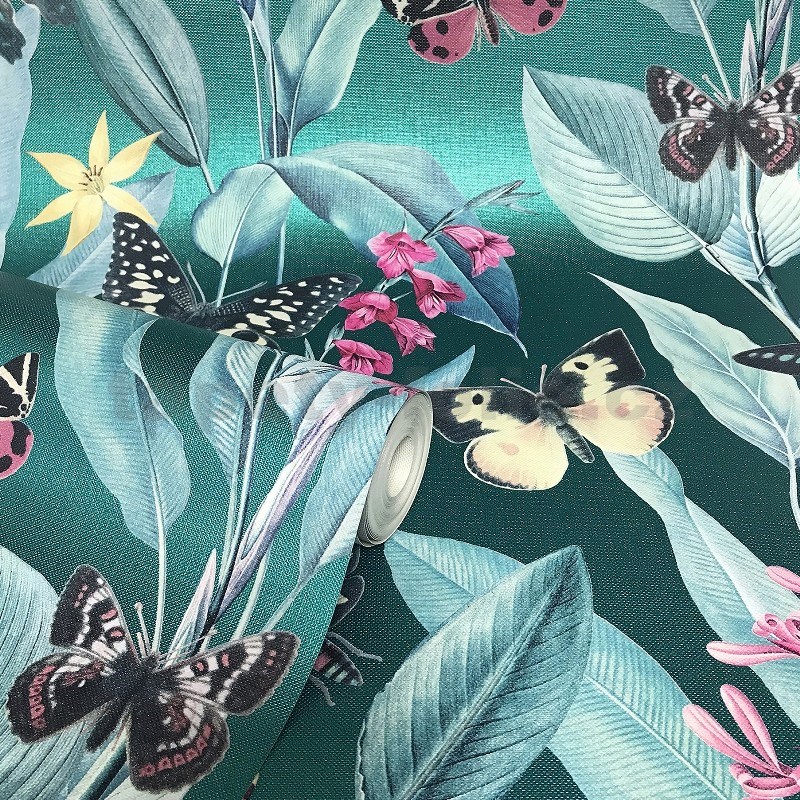 Papírové tapety na zeď IMPOL motýli na zeleném metalickém podkladu