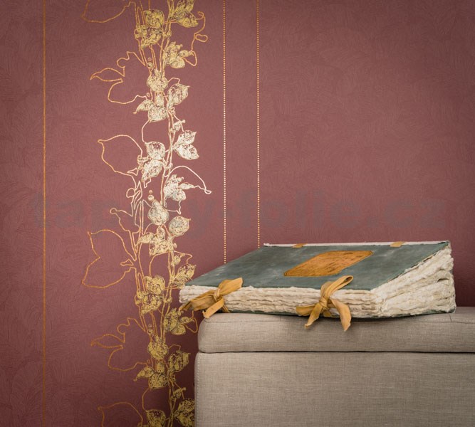 Vliesové tapety na zeď La Veneziana 3 zlaté stonky listů na vínovém podkladu