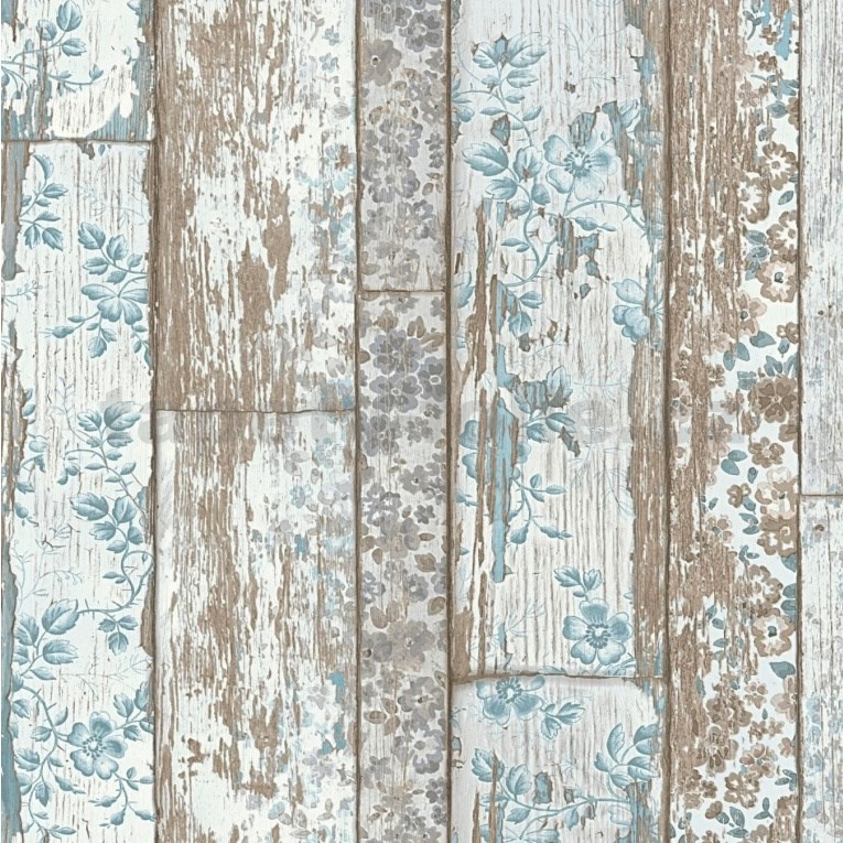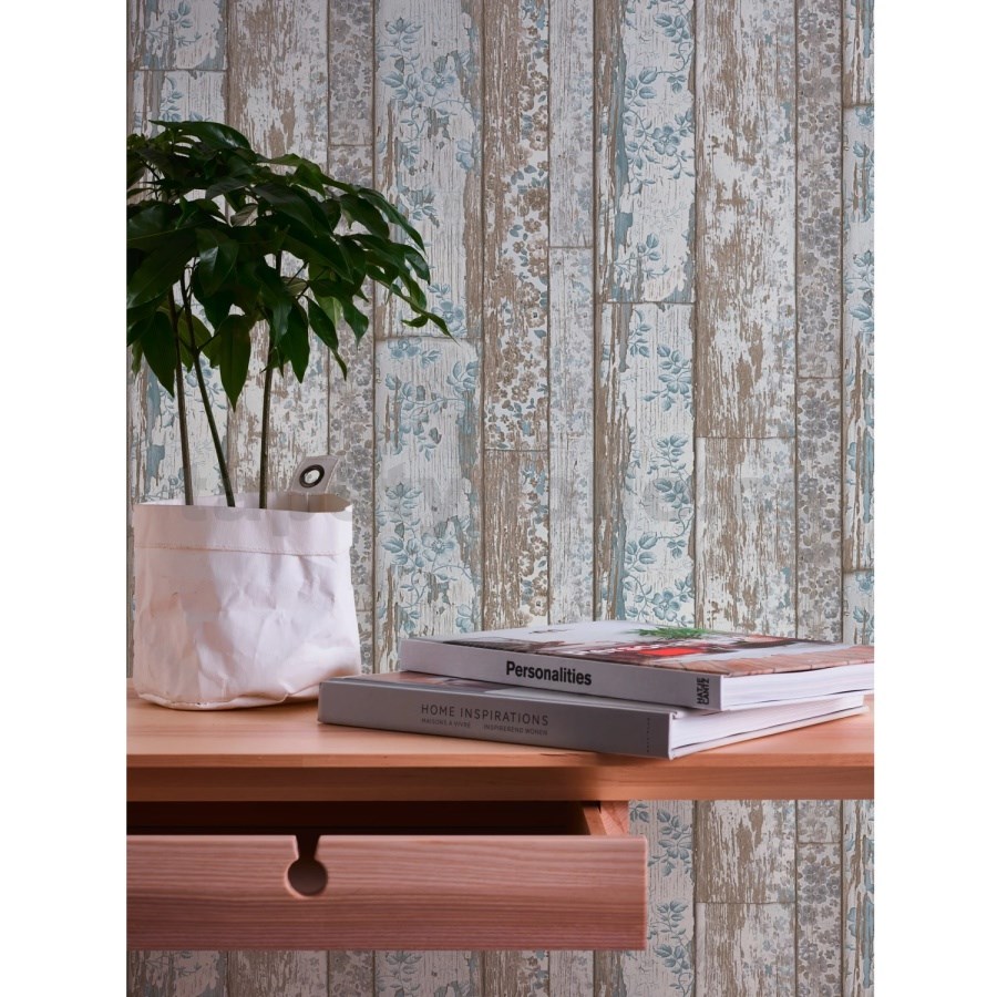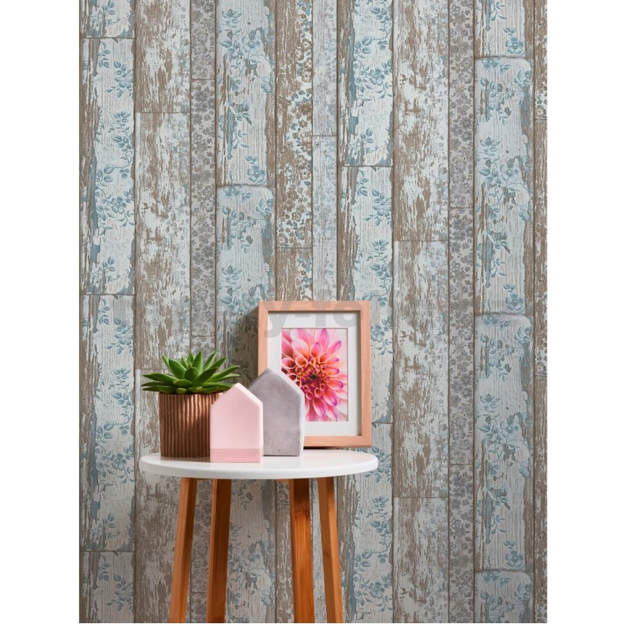 Vliesové tapety na zeď Neu Bude dřevěný obklad hnědý s modrou květinovou aplikací