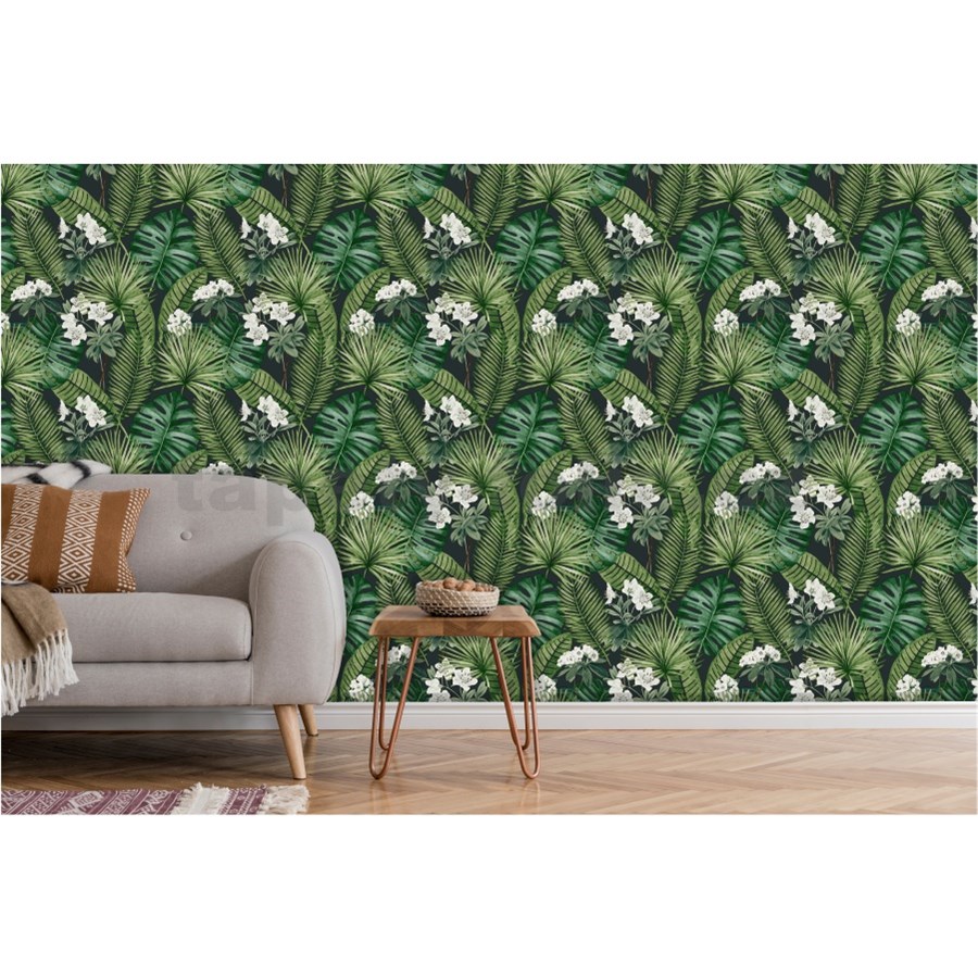 Vliesové tapety na zeď tropical listy na černém podkladu - POSLEDNÍ KUSY
